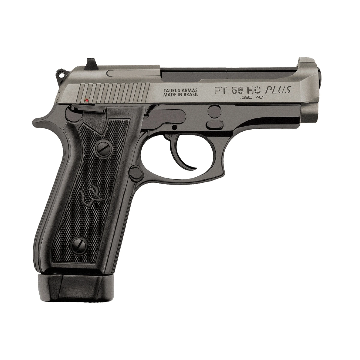 A 58HC PLUS em calibre .380 AC, possui capacidade de 19 disparos, ação SA/DA, cano de 4” e acabamento em Cerakote® Tungstênio. Possui trava de percussor e indicador de munição na câmara, além de trava manual e desarmador do cão ambidestros, aumentando a segurança do atirador. Desenvolvida em armação de alumínio, tem punho em placa de polímero e é compatível com miras fixas de 3 pontos (não inclusas). Também disponível em mais 3 cores de acabamemto Cerakote®: marrom Flat Dark Earth (FDE), Sand e Od Green.